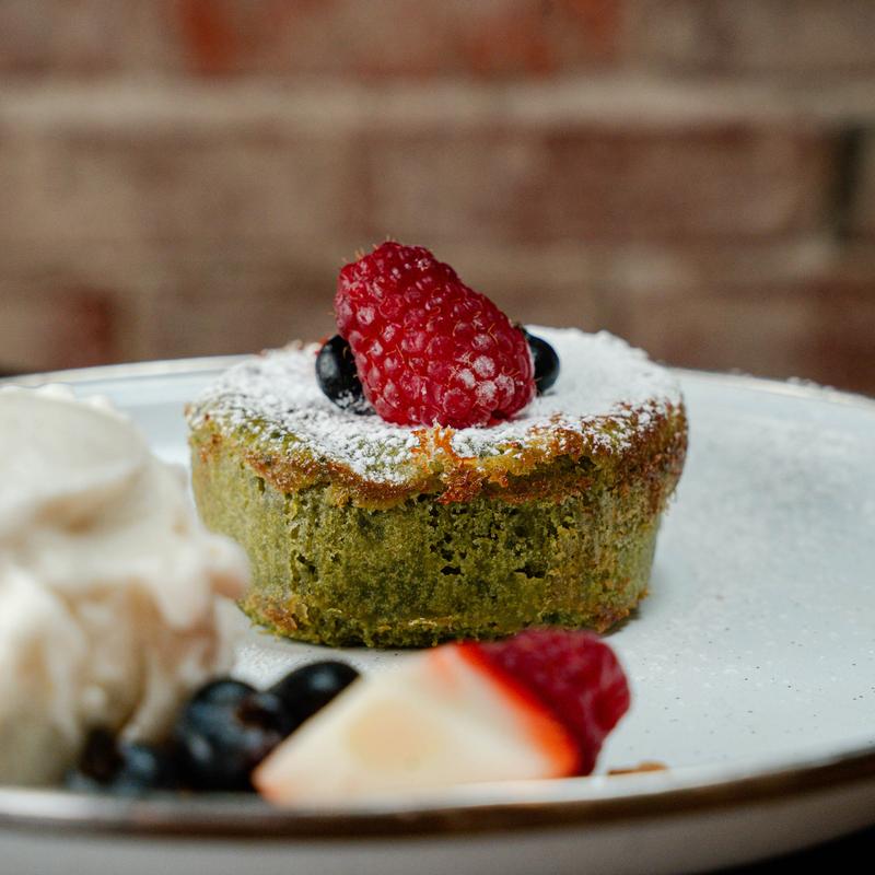 Warm matcha cake with white chocolate. Served with mixed berries, toasted pecans and gelato.