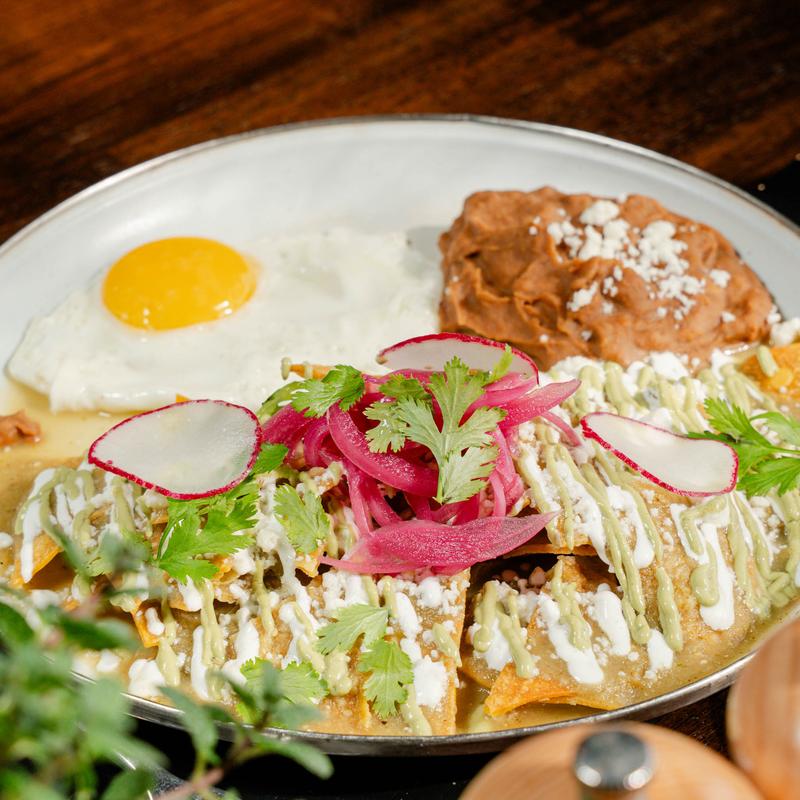 Option: Red or Green. Crispy tortilla chips, fresh cheese, cream, avocado sauce, pickled onion, cilantro and radish. Served with one egg your way and house beans. Proteins: chicken, brisket, or vegetarian (mushrooms, onion and peppers).