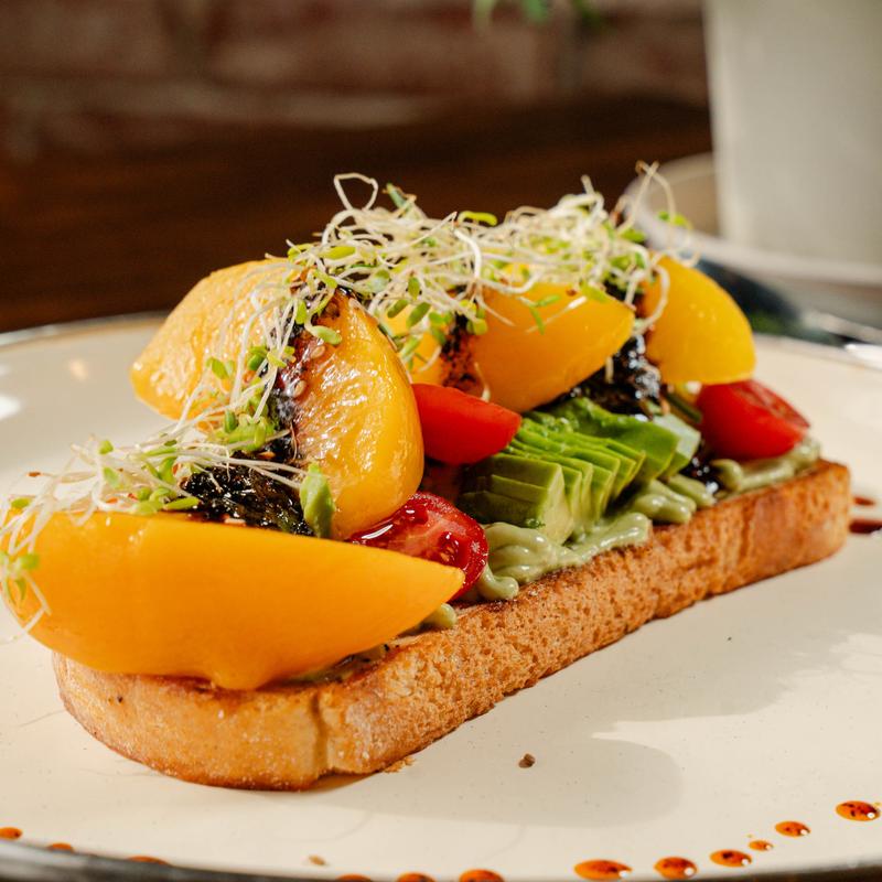 Rustic bread with avocado cream base, fresh avocado, creamy granola mix, peach, cherry tomatoes, sweet chili sauce, alfalfa sprouts and toasted sesame seeds | Add: Poached Egg.