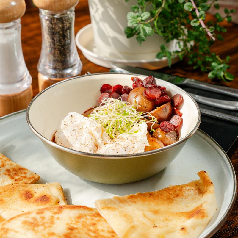 Poached eggs over red dried chili and tomato sauce, chistorra sausage, baby potatoes and alfalfa sprouts. Served with pita bread.