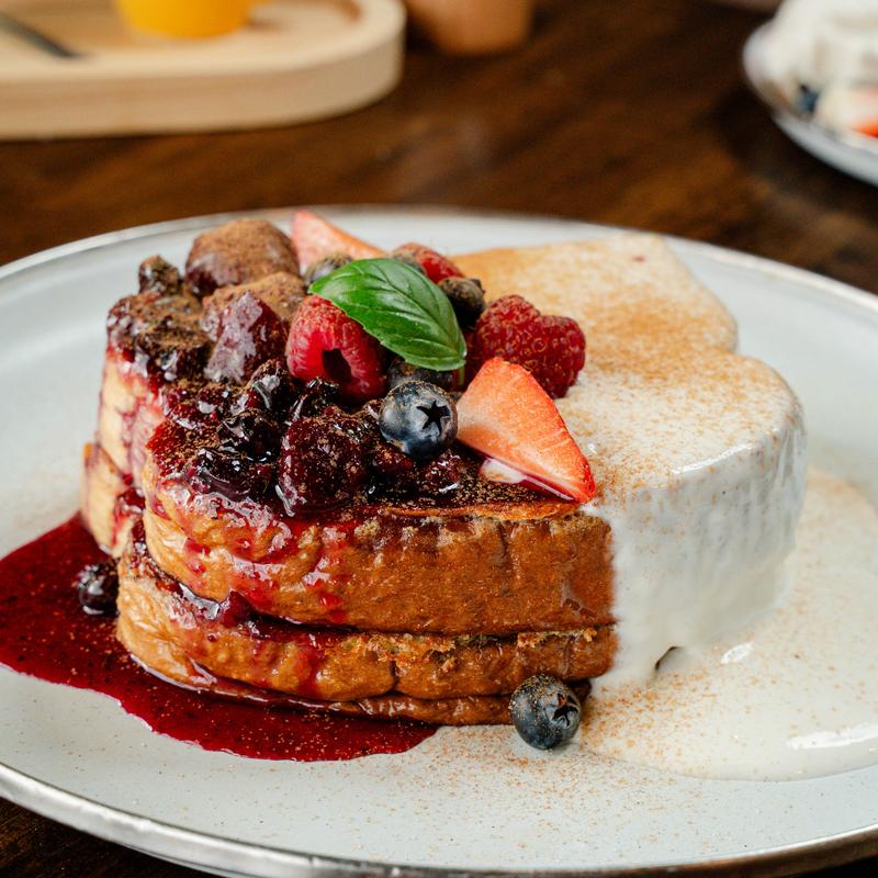 Brioche bread with mixed berry jam, a creamy yogurt-based blend and fresh berries. Finished with a sprinkle of cinnamon. Add: Bacon.
