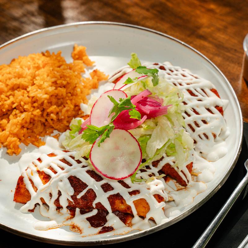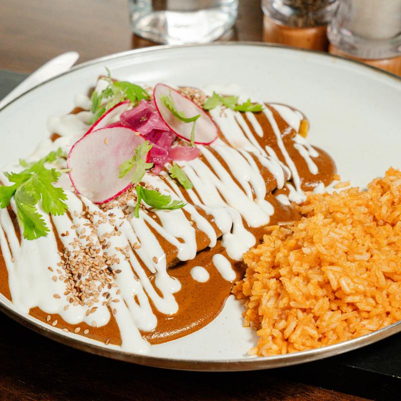 Option: Chicken or Mushrooms, 3 pieces covered in a 25-ingredients artisanal mole. Served with toasted sesame seeds, cream and pickled onion. Accompanied by traditional red rice.