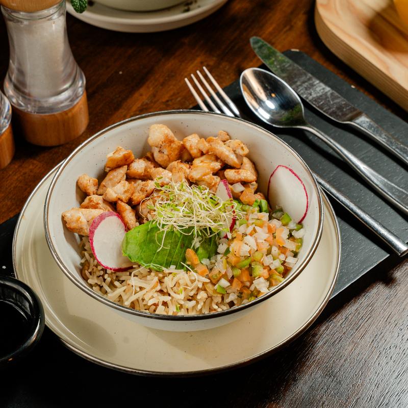Option: Chicken or Mushrooms. Rice with pumpkin and sesame seeds, avocado, radish, pico de gallo and alfalfa sprouts. Served with teriyaki sauce.