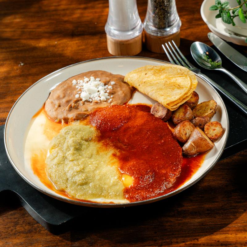 Fried eggs your way with red chili sauce and green tomatillo sauce. Served with house beans, baby potatoes and corn tortillas.