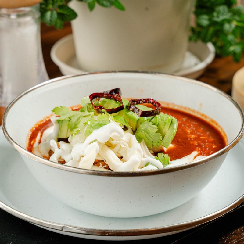 Roasted tomato base, with baked tortilla strips, Oaxaca cheese, avocado, cream, cilantro, and sautéed guajillo chili • Proteins: Chicken or Mushrooms