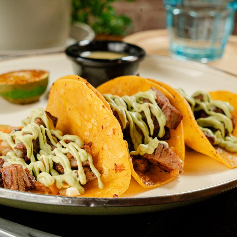 3 pieces of slow-cooked brisket, served with avocado cream and pico de gallo. Accompanied with lime and green sauce.