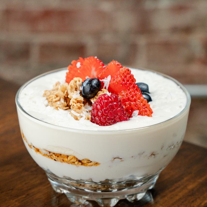 Creamy blend of natural yogurt with granola, mixed berries and honey.