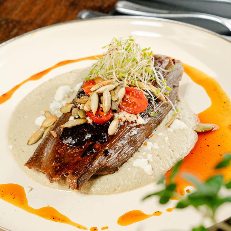 Filled with Oaxaca cheese and mushrooms, served over artisan pipián sauce made with 12 ingredients, fresh cheese, roasted tomato, and sweet chili oil