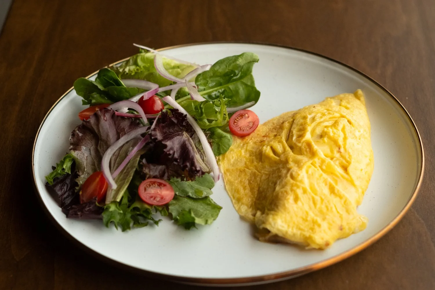 Soft egg omelette with Oaxaca cheese, roasted peppers, mushrooms, and onion. Served with a fresh house salad.