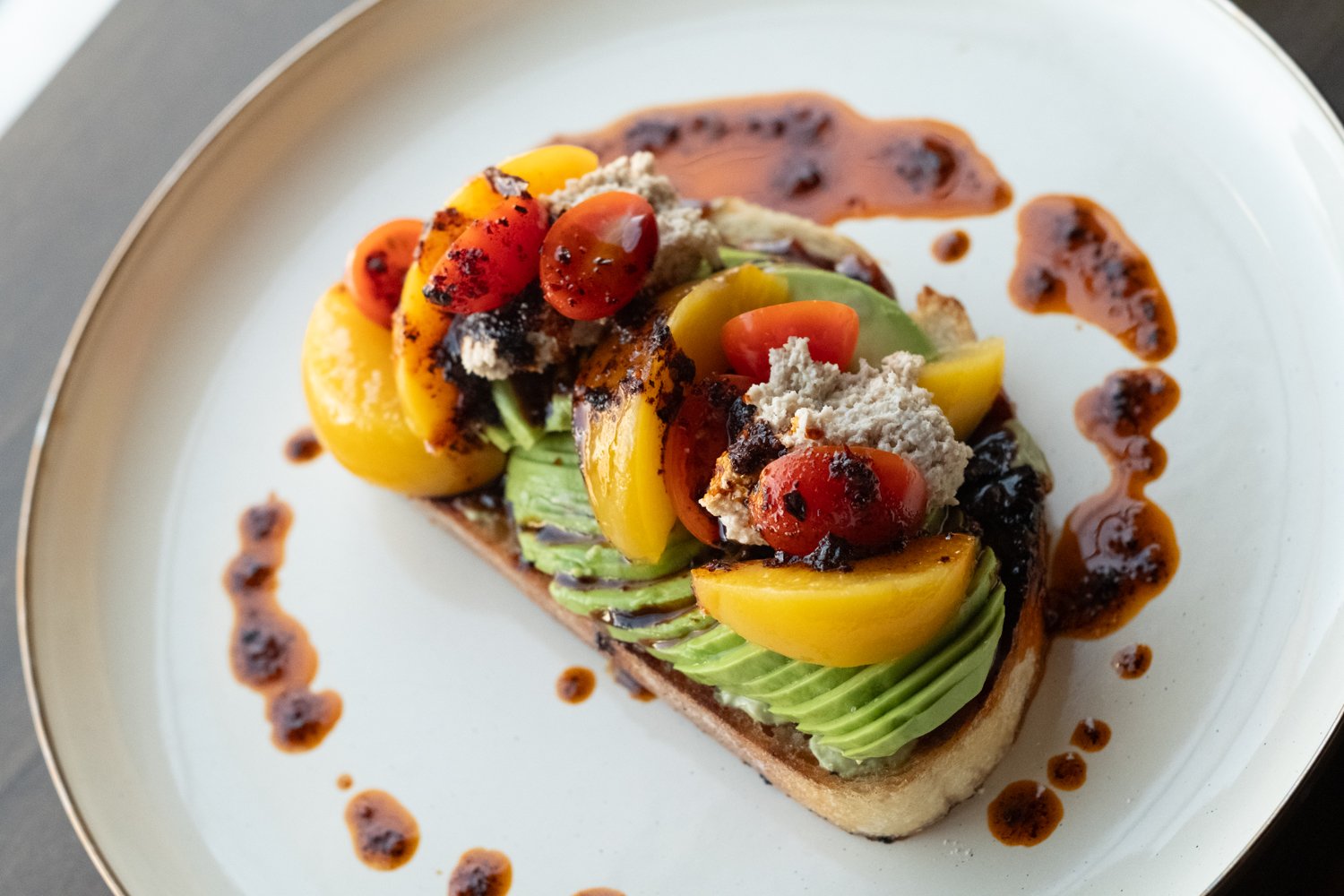 Rustic bread topped with avocado cream, fresh avocado, creamy granola mix, peach, cherry tomatoes, sweet chili sauce, alfalfa sprouts, and toasted sesame seeds.Add: poached egg (optional).