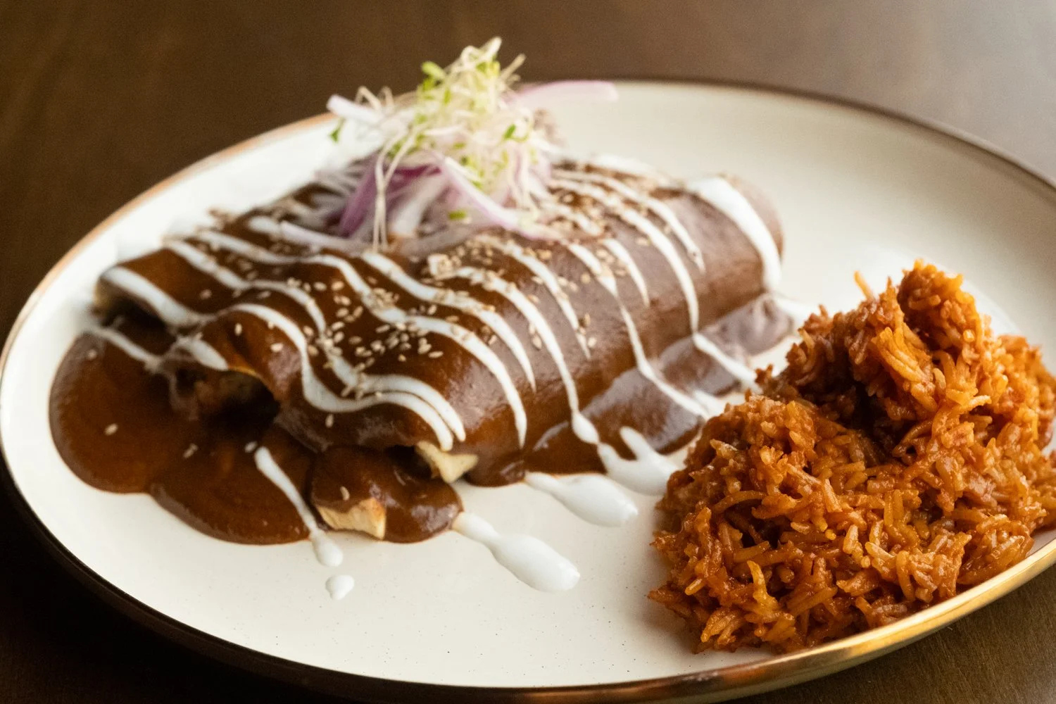 3 pieces, filled with chicken or mushrooms, covered in artisan mole made with 25 ingredients. Served with toasted sesame, cream, and pickled onion. Accompanied by traditional red rice.