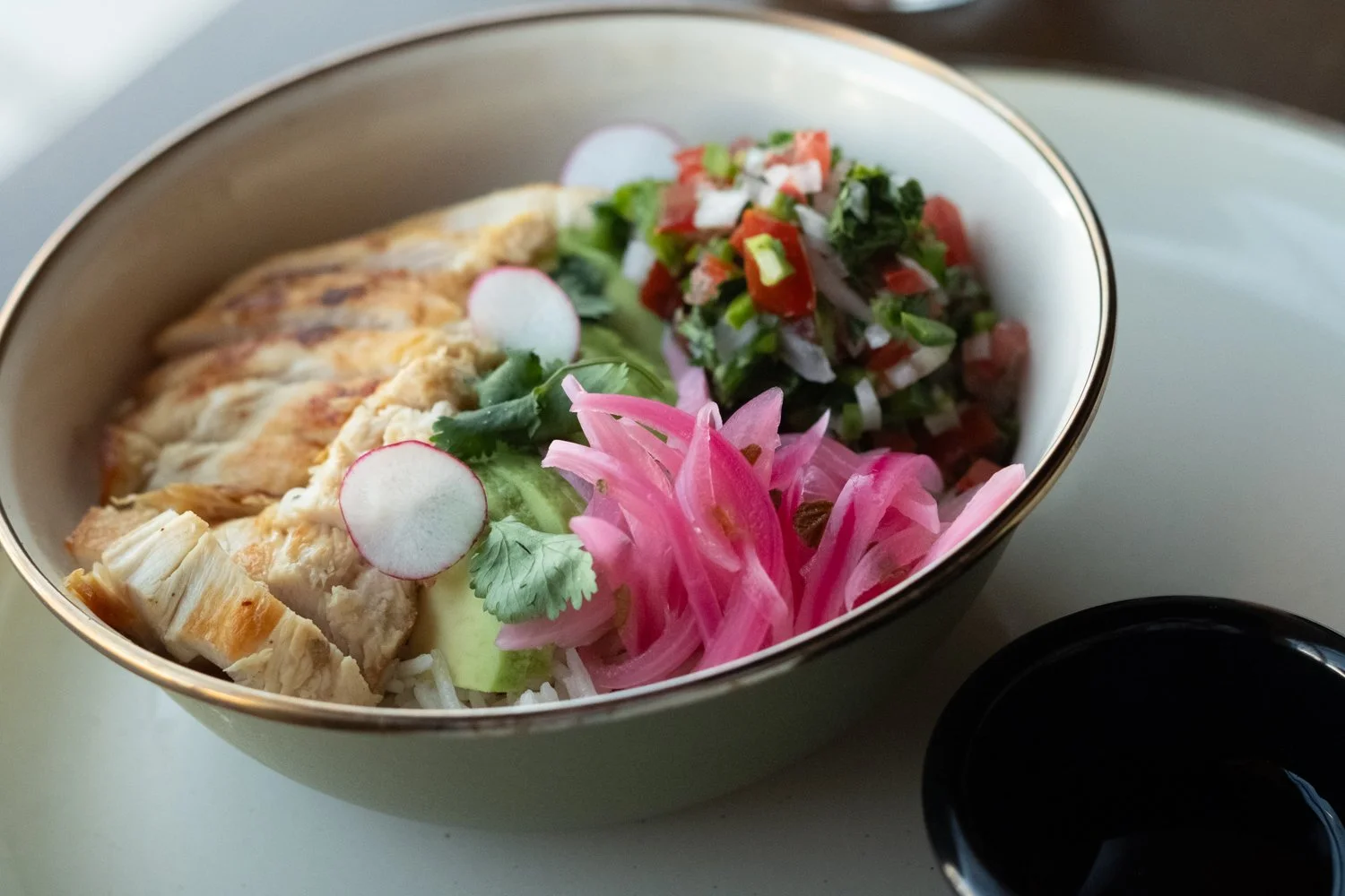 Rice with seeds (pumpkin and sesame), grilled chicken, avocado, radish, pico de gallo, and alfalfa sprouts. Served with teriyaki sauce.